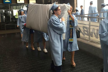 Nearer still, in terms of time, subject and location, Columbia student Emma Sulkowicz’s Carry That Weight project (2014-105) figures public shaming as a form of culturally produced durational and collective performance. Tactically, this move toward framing the attack—the ‘antagonism’ as cultural expression, as cultural performance, humorous or otherwise—shields the participants from the repressive force they unleash; they are, after all, only expressing themselves. This did not protect Sulkowicz from litigation by her rapist, but this was the only course open to him and one that underscored his privilege and guilt structurally—openly—for all to see. Not funny.