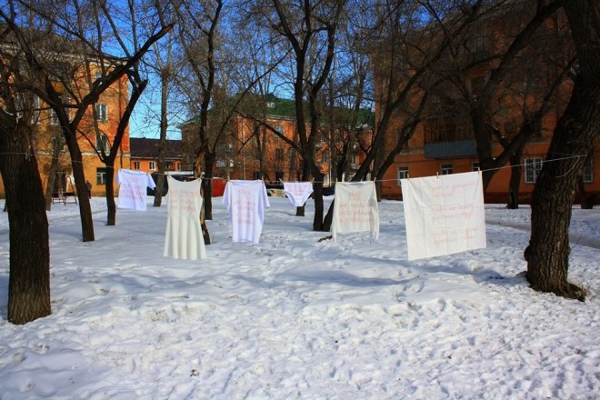 On March 8, 2016 the inhabitants of a housing estate in the centre of the Russian city Omsk [1] were surprised to encounter an odd-looking selection of crisp white underwear, bed linen, and a tablecloth hung on a washing line above the snowy surface of the estate’s inner yard. All of the laundry pieces bore short texts embroidered with red satin thread. The inscriptions summarized the rights that women in Russia obtained over the course of the last hundred years: suffrage and candidate eligibility (1918), the right to divorce (1917-1944, 1969), the right to education and profession (1918), the right of abortion (1920-1936, 1955), and the right to receive maternity benefits (1969).
