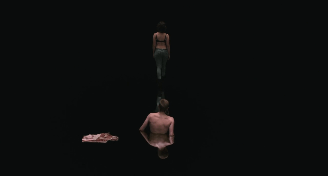 The film plunges into the abyss in its images of the inhuman violence inflicted against the protagonist’s victims. With faint, sexy music playing in the background, an enamored and oblivious man follows the woman’s swaying hips through a darkened doorway. The camera pans backwards through the door, revealing the man to have stumbled into a seemingly endless, empty plane of darkness, as he haplessly and eagerly strips, whilst stumbling forwards. As the man continues, he begin to sink with each step, as if into a quagmire, eventually leaving only his head visible. As a chilling scene involving a subtle but blood-curdling jump scare later reveals, the men are stored in the wet stuff of this cave, before eventually being sucked of their internal organs, leaving only a mass of skin drifting in the dim waters.