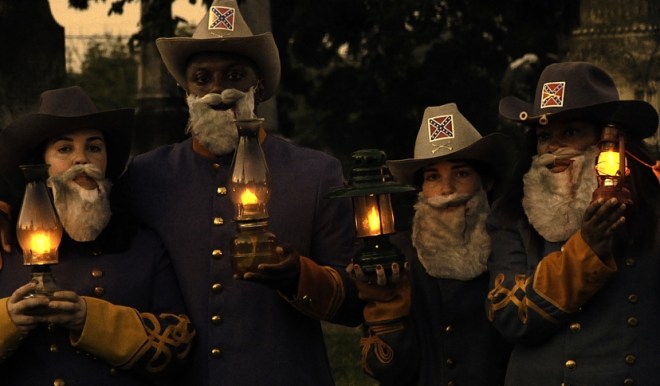 In Pope.L’s film Reenactor (2012), a continuous loop of almost six hours in its longest version, actors in Confederate uniforms and Robert E. Lee fake beards circulate through ordinary spaces in Nashville (Fig. 1). Almost everyone is costumed in this way–children and animals generously excepted, the occasional stranger wandering in. It’s clear that this condition is different in various instances. Instead of Robert E. Lee and non-Robert E. Lee positions, there are various, sometimes incommensurable Robert E. Lee positions. References to reflection indicate coerced identifications involving the “I”–the narrator of the film’s voiceover–the “you,” and the viewer, as Pope.L’s very premise that black and white actors in the film must be dressed as Lee already suggests. A young black woman who is present for much of the film’s screen time, and narrowly eludes becoming a protagonist, works at a bourgeois restaurant fashioned as a Victorian house. She stands around in the corners, dressed in her Confederate uniform and beard, and listens to her co-workers emoting about U.S. soldiers, “young people you know getting killed in Kandahar.” As she literally drags a heavy piece of baggage–an unwieldy suitcase–across the streets and highwaysides of Nashville, as some kind of Robert E. Lee the viewer observes her.