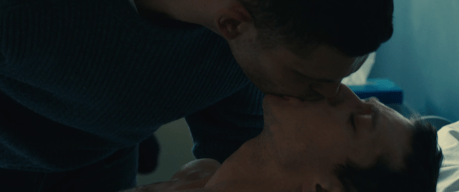 Tibauld passes Nathan on the way out. Sean and Nathan talk about painkillers, clean clothes, the cold and heat. Sean is in pain: “I don’t know if it’s the fever or the fear”. He is overwhelmed by his sickness. The clutter of sickness and care are the way of the pleasure of intimacy. Then, without a word, Nathan steps from the window and kisses Sean, intensely. Sean leans upwards for it, Nathan’s hand falls down his chest. The camera steps back to watch a quiet handjob, the flat blue gloom of the hospital room exchanged for the shady contours of the bedroom. Almost nothing is hidden; we see Sean’s KS lesions. The whole act is furtive, quiet, time snatched from the constant, silent discipline of medical care.