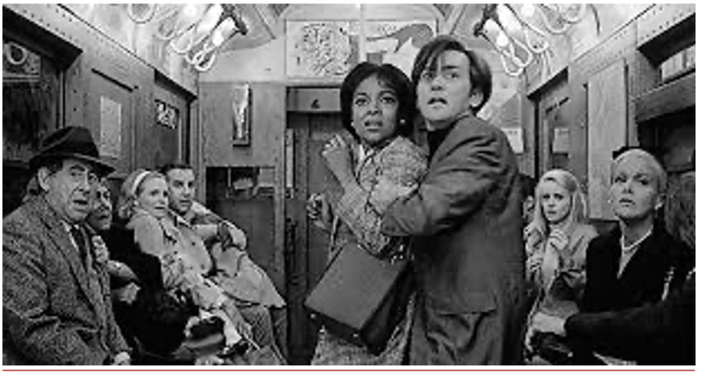 In dramatic films, the subway is often presented as the primary space in which different socioeconomic classes meet. The subway is the scene of class anxiety, especially from the perspective of bourgeois characters. In the 1967 film The Incident, which features Martin Sheen in his first feature film role, two toughs (Sheen and Tony Musante) terrorize the 14 passengers of a subway car in New York City. The subway provides a claustrophobic setting for the ruffians to provoke a cross-section of the social order, from an elderly Jewish couple to a couple of soldiers to a Black couple and a displaced man who remains passed out for the duration of the trip. The Incident anticipates New York City’s decay and conflict of the 1970s, in which the underground supplies the mise-en-scène for classist and racist resentment. By 1975, city budget cuts prompted the New York police and fire departments to distribute a pamphlet with the headline, “Welcome to Fear City.” The loss of manufacturing jobs in the city, and the move of substantial capital to the suburbs, depleted municipal coffers and ushered in a sense of fear and dread. As Michael Cisco writes, “This was the dystopian New York City of Little Murders (1971), Mean Streets (1973), Soylant Green (1973), Death Wish (1974), The Taking of Pelham One Two Three (1974), God Told Me To (1976), and Taxi Driver (1976).”[xv]