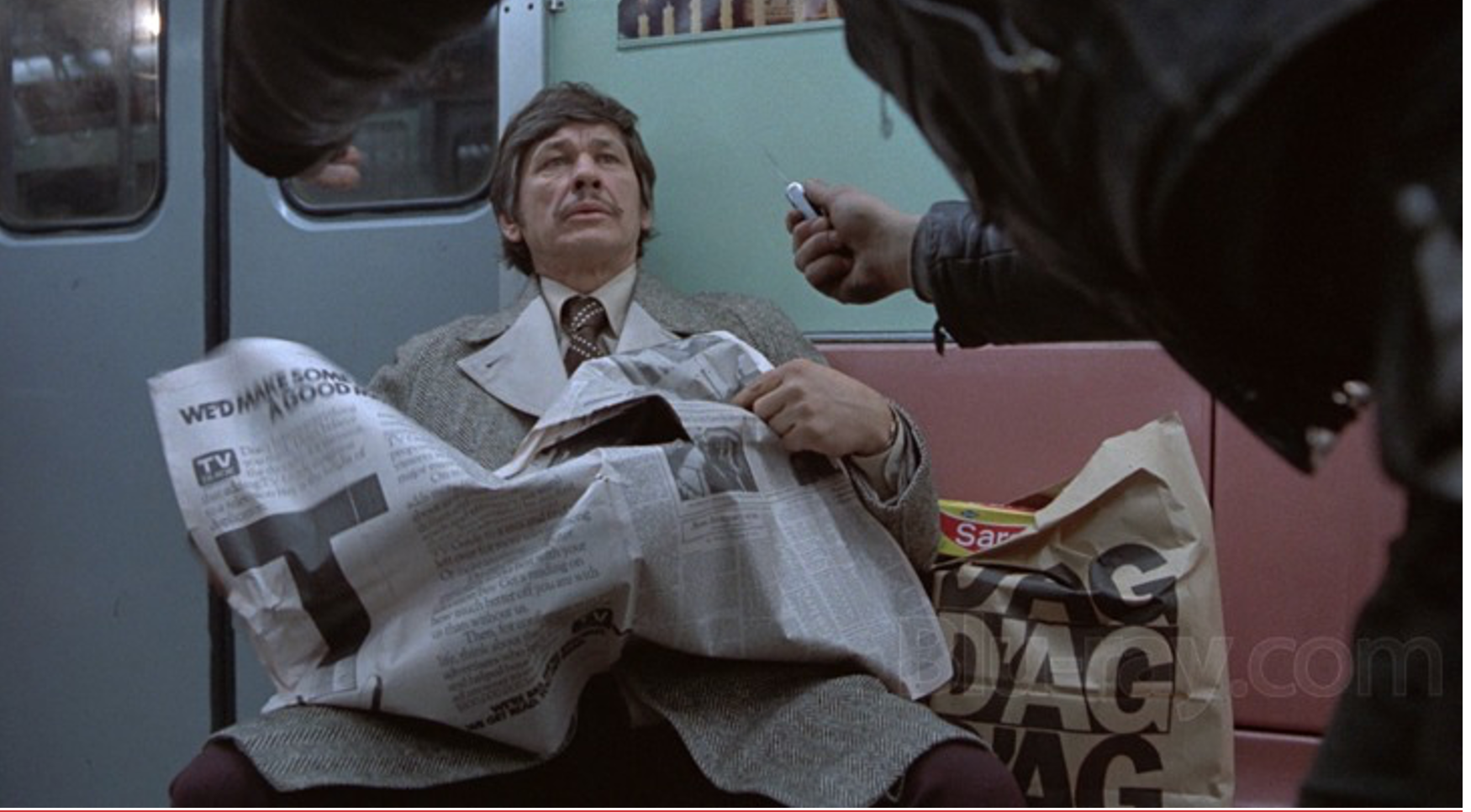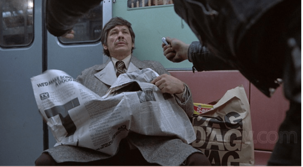 Death Wish is the most reactionary of these films. Its most famous scene, later imitated by real-life racist vigilante Bernard Goetz, portrays Paul Kersey (Charles Bronson) as an architect on a mission of vengeance after the murder of his wife and rape of his daughter. Kersey finds himself confronted by two white men on the subway. These are the updated versions of Martin Sheen and Tony Musante. One man draws a knife on Kersey, so he shoots the assailant and his partner. Death Wish provided a fascistic template for future vigilante films of the Reagan Era; and much like Jaws (1975) would engender a fear of the ocean, Death Wish captured white bourgeois moral panic attached to public spaces in New York City, especially the subway, which would again become the setting for a clash of classes in Walter Hill’s cult classic The Warriors (1979).