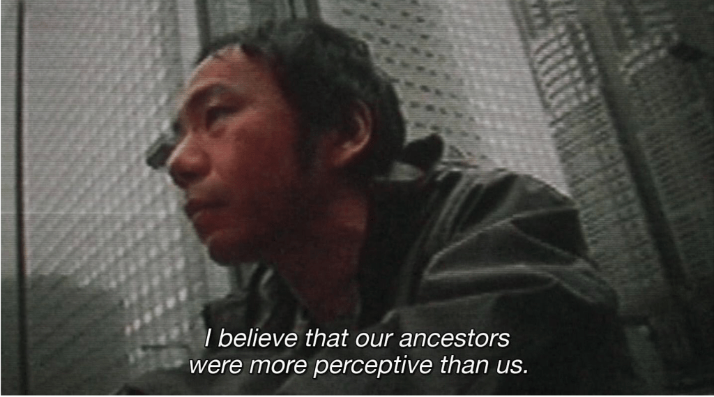 Marebito (2004) parlays the promise of abandoned underground tunnels and passageways, this time from WWII-era Tokyo, into the premise for an urban myth about the lost knowledge of pre-modern societies. Videographer Masuoka films a bizarre suicide in the subway system: a man stabs himself in the eye while apparently terrified by something invisible. Masuoka experiences disorientation as he descends into the abandoned tunnels beneath Tokyo, much like Rose McGowan’s Kelly in The Sound. What Masuoka finds beneath the subway is an assortment of occult theories about a Hollow Earth and Mountains of Madness. Marebito, the film Takashi Shimizu shot between production of Ju-on (2002) and The Grudge (2004), flaunts its influences, and uses familiar occult mythology for a story about the knowledge concealed by modernity, Lovecraftian terror mixed with postmodern instability. Masuoka eventually provides the film’s thesis: “I think humans are a degenerated species. I believe that our ancestors were more perceptive than us. They could see creatures from a different dimension…sneaking into our dimension.” Through his adventures beneath the subway system, Masuoka discovers a naked, mute woman and brings her back to his apartment. There, he eventually discovers that she needs to consume blood to survive, and he becomes a serial killer to feed her need. Masuoka’s pursuit of the suicidal man’s terror brings him into conflict with an alien being and primal violence. As another character in the film reveals: “The feeling we know as terror is actually ancient wisdom that’s sealed in our subconscious mind.” This trip on the subway includes an archaic stop in the Uncanny.