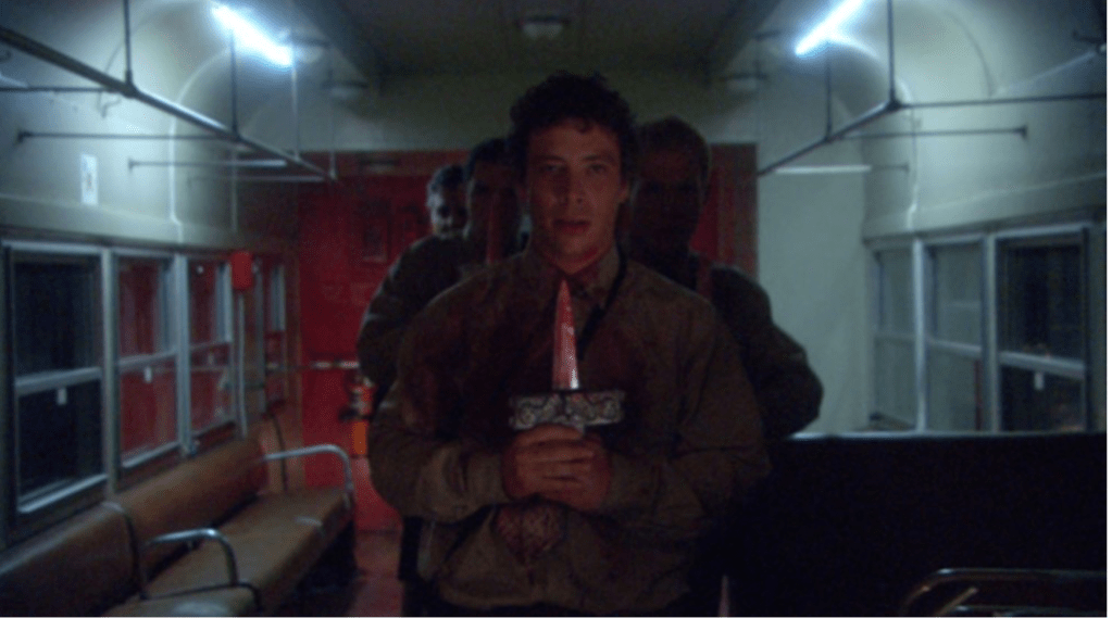 The subway can be considered an example of one of Carol Clover’s Terrible Places, “most often a house or tunnel, in which the victims sooner or later find themselves.”[v] For example, one of the most famous moments of gore happens in the cold open of Sion Sono’s Suicide Club (2001), in which 54 teenagers join hands on a platform in Shinjuku Station, Tokyo, and jump in front of an arriving subway train. The horror derives not so much from the location of an underground tunnel but from the scale of the suicides and the quotidian quality of the location. The passengers inside the train witness waves of blood and body parts against the windows, while the people waiting on the platform are doused in blood. The shock of having an urban routine violently interrupted transforms the subway from a banal instrument of travel into a deadly weapon. Later in the film, a mass suicide involves students jumping from the roof of a school, another quotidian space made horrific by cult behaviour, a deadly détournement.