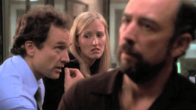 None of this, we might think, makes her a particularly good candidate for the job. But then the real reason slips out. “When was the last time you saw her?” Skinner asks McAvoy, who’s storming out to find a way to prevent the hire. Flustered, McAvoy recalls that it was about three years ago – to which Skinner blurts, “Coincidentally, that’s the last time you were a nice guy!”