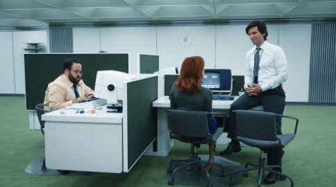 What’s most dystopian about Severance is its fundamental contradiction: to be truly severed from work is impossible, but at the same time, even while at work the employees have no idea what they’re doing. They spend the day staring at data on desktops. Newly severed employee Helly (Britt Lower) is advised to look for the “scary numbers.” Eventually Helly asks Dylan (Zach Cherry) “what even are these numbers?“ and he shares his theory that they’re cleaning the sea.
