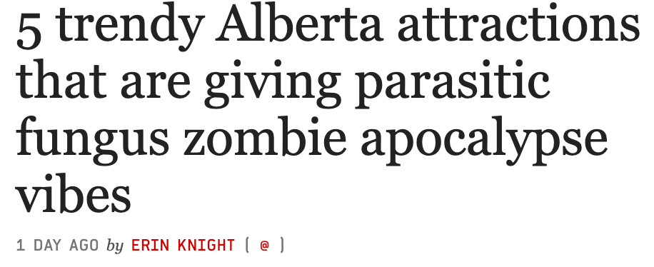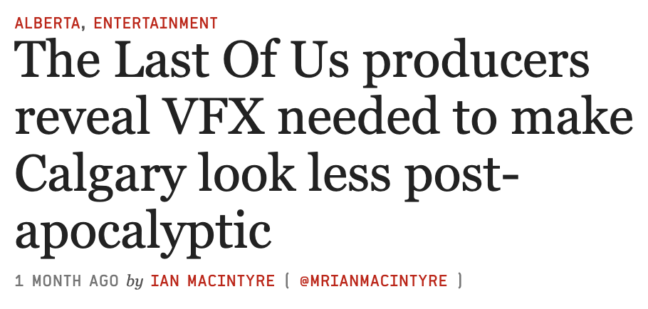 The transformation of Alberta in real life, environmentally and socially, from a popular location for Northwest ‘Mellers in which American filmmakers could depict humans “pitted against the mighty forces of a vast and sometimes inhospitable and unforgiving but terribly beautiful ‘nature,’ both in the film plots, and in the tremendous work involved to capture the spectacular scenery” (64) to a setting so appropriate for filming a post-apocalytpic video game that satirists almost shame themselves when producing easy punchlines is a transformation of shocking continuity and tragic simplicity. The Last of Us filming locations are now “Instagram hotspots,” democratized spectacle from an ultra-conservative petrostate whose per capita greenhouse gas emissions are three times the national average because of the oil and gas industry.