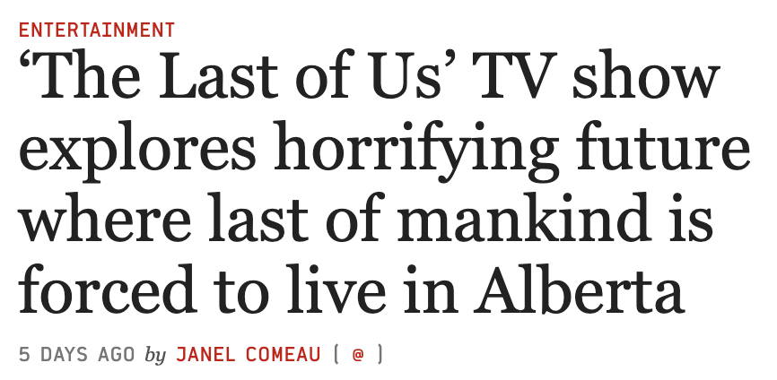 Alberta is already known as the most reactionary province in Canada, thanks to almost 50 consecutive years of conservative rule. In fact, Alberta is often called Florida North or Texas North, because of its mixture of social conservatives and the domineering presence of Canada’s oil and gas industry. The Canadian satirical website The Beaverton wasted no time connecting Alberta’s political reputation with its selection as the location for a post-apocalyptic story:
