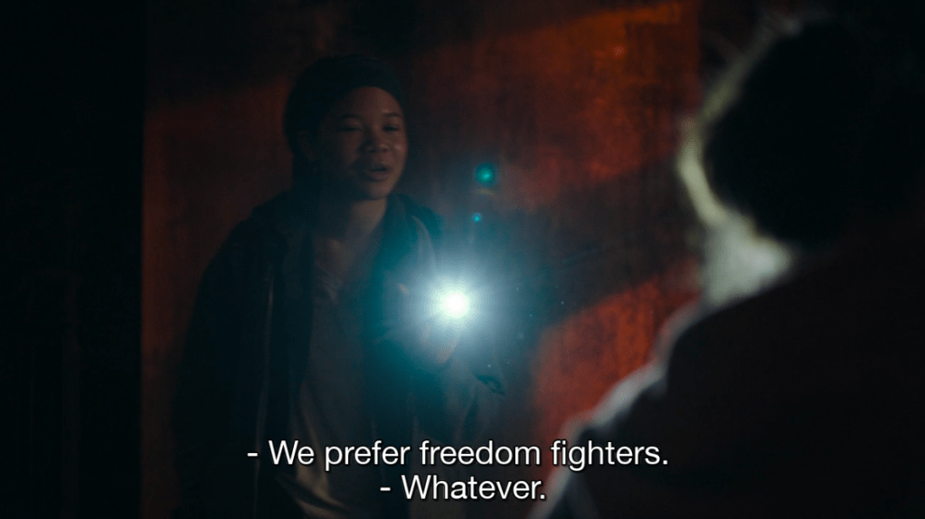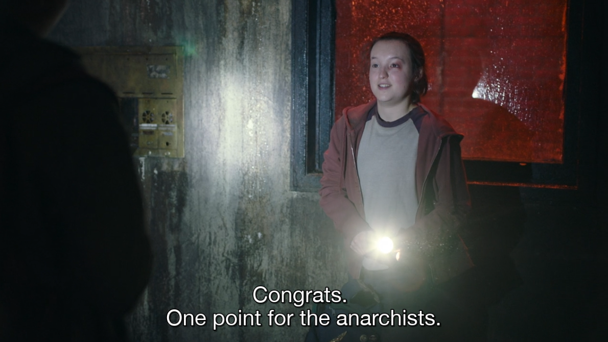In addition to the commune in Jackson discussed above, The Last of Us betrays at least an awareness of revolutionary ideologies and the language games that surround them. As Riley stewards Ellie to their final meeting in the dead mall of the Boston Quarantine Zone, Riley, now identified as a member of the Fireflies revolutionary militia, tells Ellie that Fireflies flashlights are superior, which leads to this exchange: