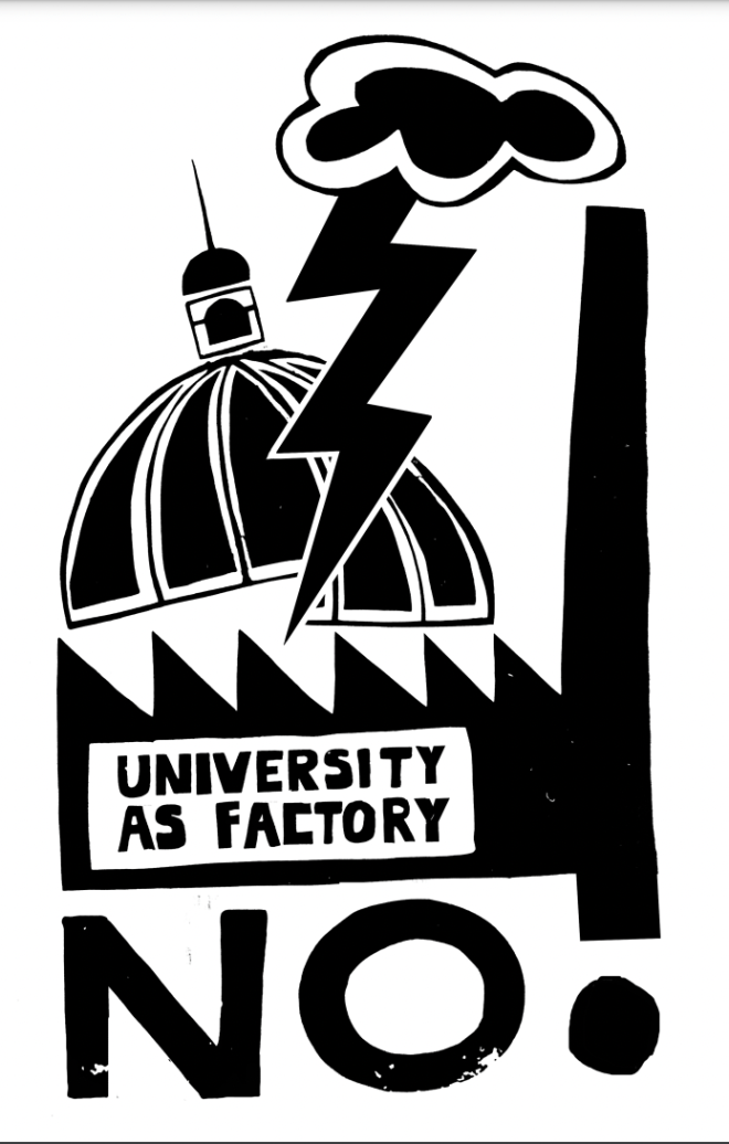 Universities are phallic knowledge machines designed to accumulate at all costs. Capital and the university collide in the model of the rich American private university, where the value of the institution lies in the size of its endowment. Everyone wants to be well endowed. Private capital is the Viagra of the modern university.[5]