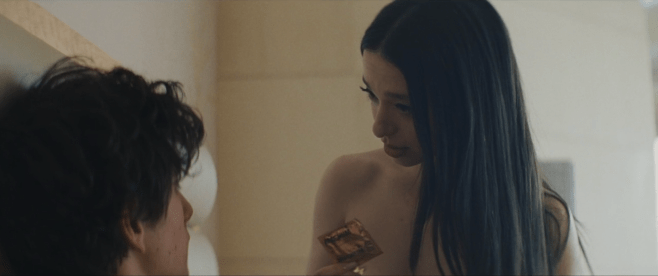Only it doesn’t go on – ever. Not only because a shot of Mark Eydelshteyn’s genitals would bust through the film’s R rating – the MPA’s sexed bias is well documented – the application of the condom is neither mimed nor further referenced. The scene cuts jarringly to the couple mid-coitus, with Vanya on the brink of orgasm and Ani, of course, doing all the work. Then it cuts again to Ani dressing herself, Vanya’s lap coyly hidden beneath the sheets and the condom presumably discarded. That fleeting glimpse of its shimmery wrapper suggests an omnipresence that the film ultimately has no interest in depicting.
