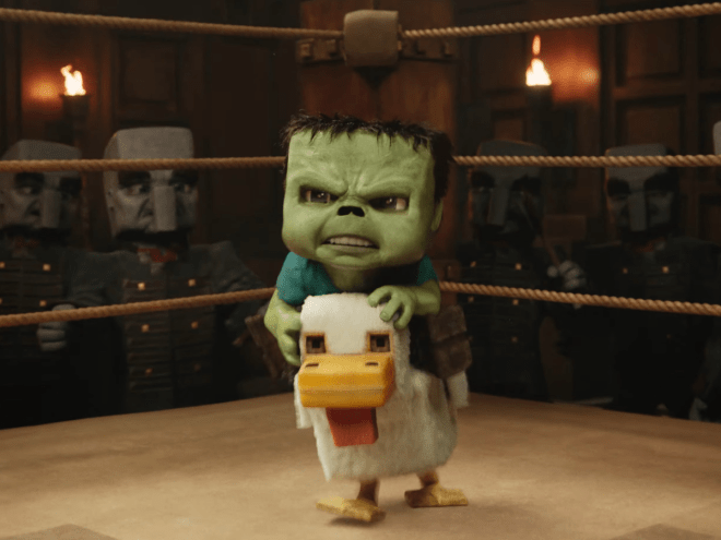 The Minecraft simulacrum does what, exactly? A viewer might feign a chuckle at Jack Black prescriptively breaking into his exaggerated heavy-metal singing voice; they might raise their brow in recognition when he says “Chicken Jockey” (I know what that means after looking it up, but I refuse to retain such knowledge); they might point indifferently at the screen, to signal “hey, I know this reference” when they see a Villager™ for the first time; they might request a refund from Amazon for having paid $20.00 for literal slop at home, like my friend did after we watched it together on his dime (thank goodness); or they may just erupt into a popcorn battle in the theater, which has nothing to do with the cultural product on display and is sparked merely by a mass of Minecraft (the video game) enthusiasts all gathered in one place out of obligation to an IP that is now numbingly rendered for them in “live-action” form.